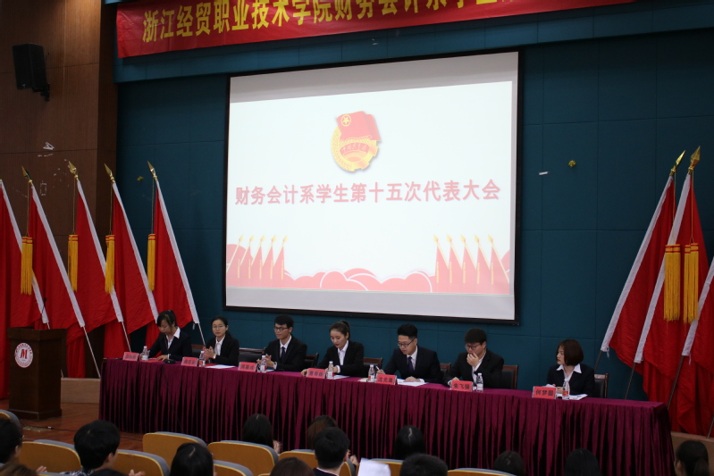 2018年11月6日下午,浙江经贸职业技术学院财务会计系学生第十五次代表大会在图书馆一楼报告厅隆重举行。系团总支书记夏欢老师,辅导员许菁、张刚、周草、严晓莉老师,以及由系部169名学生代表组成四个代表团参加,系文案部部长吕丽丽主持。