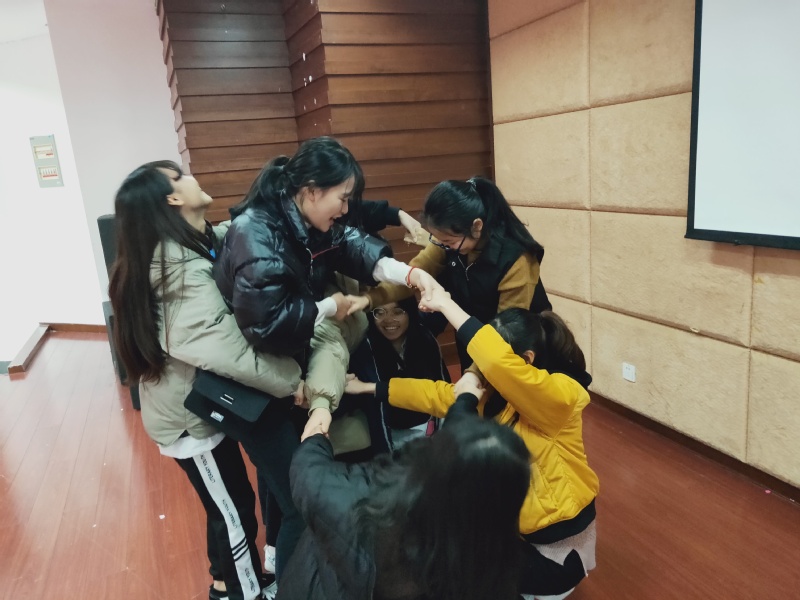 第四项是“抱团游戏”,各寝室四名同学全部参与其中,由主持人报数字,大家根据数字对应的人数与周围抱成一团,每轮“落单”同学则淘汰出局。