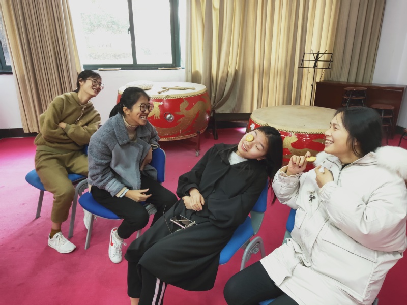 在“动作接龙”中,寝室四名同学排成一队,由第一位同学先看歌名,通过肢体动作依次将意思传达给最后一名同学,猜出歌名最多者为胜。