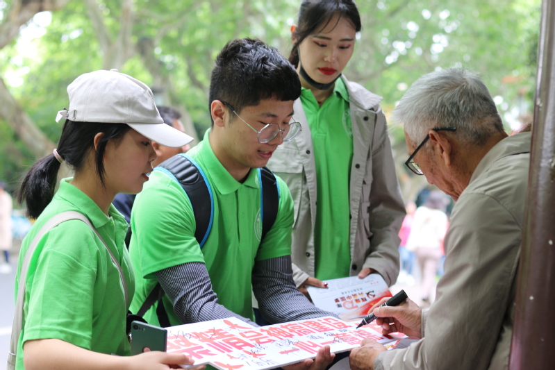此次毅行活动总长7.5公里,用时5小时,途经断桥、白堤、岳庙等西湖景点。活动过程中,学生围绕“新中国成立70周年”这一主题与西湖边的游客展开知识竞猜、资料发放、KT板签名等互动,并向他们推荐爱国相关书籍和影片。游客们积极配合,通过签名留言的方式抒发自己对于社会变迁的感触和对祖国未来的展望。