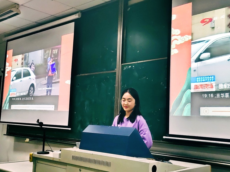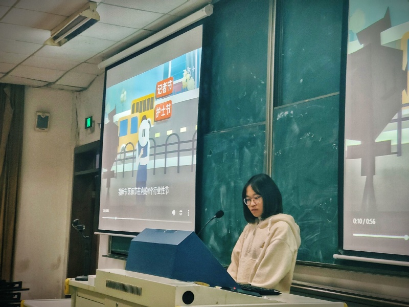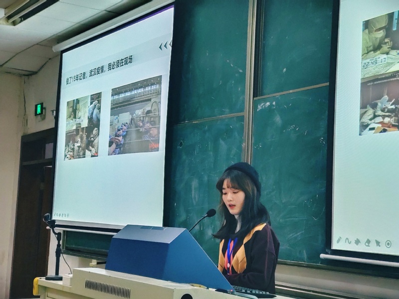 活动上12名学生自由选择顺序上台演讲并展示PPT,在此次活动中,有学生讲述了战疫记者前入病房了解最新情况所展现出来的不畏牺牲精神,有的学生描绘了新闻记者在恶劣天气仍在第一直播现场所体现出来的无所畏惧的精神,有学生赞美了新闻开拓者记录历史、立此存照的职业精神与道德良心……正是因为新闻记者们牢记自身的责任担当,他们才有勇气不畏艰难险阻,一次次给大众带来最新资讯、一次次为大众发声。选手们振奋人心的演讲充分展示了我系学子对新闻工作的热爱以及他们蓬勃向上的精神风貌。