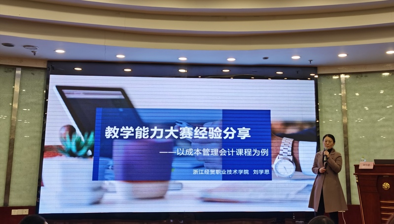 本次研讨会的主旨是为了适应高等职业教育发展的新形势和新变化,进一步研究高等职业院校财会类专业创新与实践教学的建设方向,充分发挥职业教育工作者人才培养的作用。刘学思老师的汇报主题是“教师教学能力大赛获奖经验分享——以《成本管理会计》课程建设为例”,介绍了我系刘蕾、吴燕、刘学思、吴晓霞四人团队教师教学能力大赛获奖的心得,认为比赛的成功依托于学校会计专业课程改革与专业建设,分享了专业教师团队结合教学标准、深入行业调研、配合资源建设,进行教学内容重构,完成课程改革的经验。