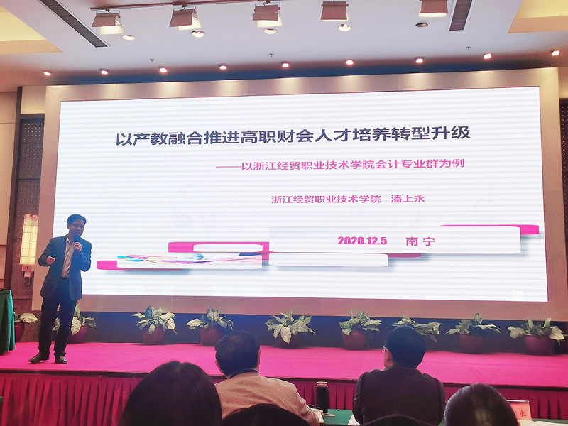 财务会计系主任潘上永在财经商贸类论坛上作了《以产教融合推进高职财会人才培养转型升级——以浙江经贸职业技术学院会计专业为例》主题报告,从产教融合行动、产教融合效益和产教融合作用三个方面进行了阐述,向与会者介绍了财会系与财务公司保持稳定合作11年,近5000人次学生在校内代理记账部开展实习实践;与杭州经济开发区税务局合作11年,学生以轮流顶岗模式开展实习实践,为区属企业开展纳税服务;与金财互联、云账房公司分两阶段建成智能财税大数据中心,每月可开展近万家企业代理记账、纳税申报业务;与杭州恒生聚源公司合作建成金融数据工厂,参与学生近300人次,完成了5000多家发债企业财报数据采集业务。在产教融合模式的不断探索过程中,财会系创造了一系列的教育效益、经济效益和社会效益。