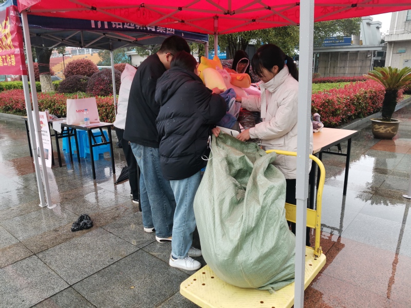 早上9点,工作人员便在体育馆前搭起帐篷,等待同学们的参与。活动当天虽然下着雨,也没有磨灭同学们捐赠物品的心意,他们源源不断地来到爱心棚前进行物品捐赠,有的同学捐赠了自己的衣物,希望山区的孩子可以穿的暖;有的同学捐赠了课外读物,希望山区孩子们可以多看书,增加知识面。本次活动不仅吸引了同学们的参与,老师们也参与到了活动中。会计党支部的吴霞、李娇娇、刘学思等8位老师也来到志工部捐赠爱心棚前,为山区孩子捐赠了书籍和杂志。我系广大师生为山区孩子捐赠物品的热情高涨,志工部更是将先前准备摆放捐赠物品的桌子从两张增加至六张。除上述物品外,我系还为山区孩子捐赠了全新保温杯、台灯、背包等生活物品,希望山区孩子们在新学期能够努力学习,走出大山,学习新本领,将来建设家乡回报社会。截止下午5点30分,志工部共收到捐赠的书籍97本,衣物216件,玩偶102个。本次活动捐赠的衣物更是重达50千克!我系收集到的捐赠物品在活动当天和第二天分别由“蚂上回收”、“铛铛一下”平台回收,转赠给山区孩子。