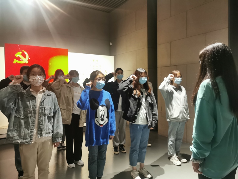 浙江革命历史纪念馆是全国爱国主义教育示范基地,是展示革命历程的重要窗口。高老师带领学生们参观了展厅中“南湖红船与中共一大”、“大革命的洪流”、“土地革命的风暴”、“钱江两岸的抗日烽火”、“走向解放之路”五个部分。高老师在“五四运动在浙江”板块中讲到,“五四运动,是一场以青年学生为主的爱国运动,而在场的同学们正值青春年华,希望同学们能够向这些革命先烈学习,发挥优秀学生的带头作用,并为祖国繁荣昌盛奉献出一份力量。”除此之外,他还为学生们介绍了浙江先进分子对创建中国共产党的贡献:1920年6月,陈独秀与俞秀松、施存统等在上海建立了第一个共产党组织,它在全国范围内起到了建党的发起和联络中心的作用。与此同时,学生们通过观看现场珍贵文物、模型展示、影像播放等方式,直观地了解了浙江人民在中国共产党的领导下,历经浴血奋战赢得革命胜利和解放浙江这一波澜壮阔的革命历程,大家都被革命先烈为了国家与人民的利益、不怕艰难困苦、不怕流血牺牲,坚韧不拔、勇往直前的革命精神深深震撼。最后,36位入党积极分子在党旗前举右手握拳庄重宣誓誓词。