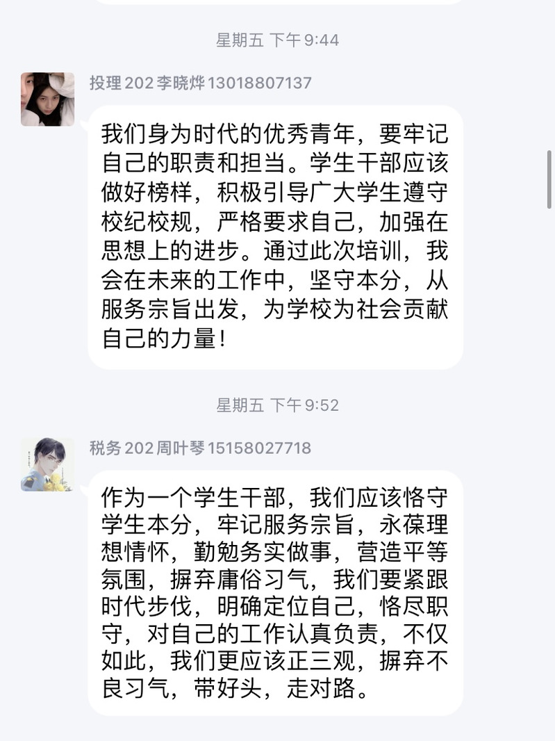 三是采取灵活方式,多措并举学习。除专题学习和集中学习外,呼吁全院学生进行网络学习和个人自学,在学习形式上采用“线上+线下”、“自主+集中”、“重点+全面”。个别部门在QQ群采用屏幕分享、语音通话等云会议方式,带领成员共同学习了关于习近平总书记贺信、学联报告等内容,全体成员认真聆听、积极响应,在群里踊跃发言。班长学委例会上,向各班主要学生干部宣传号召学习《关于学联学生会工作人员改进作风服务同学的若干规定》,参会成员结合自身工作心得体会就学习贺信精神与学联规定做了充分交流。同时利用大一学生晚自习时间,集中开展学习若干规定的特色晚自习活动,激励学生深刻领悟新时代青年的时代责任。