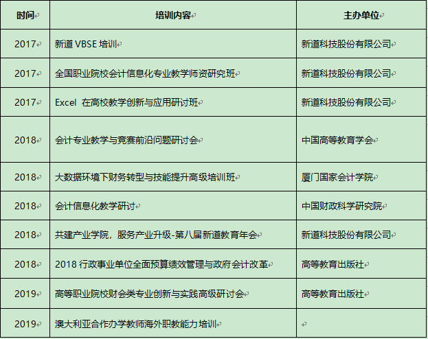 2017年-2021年期间,吴晓霞老师不断通过参加不同类型,不同组织的培训,提升知识结构的多元化,积累教学素材,拓宽视野,培训项目包括: