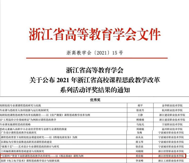 她将思政教育积极融入课堂教学,积极参与课程思政方案的设计,并协助完成了多篇课程思政案例的资料整理,为财会学院编写出版《财会课程思政案例与教学设计》一书收集整理了税务相关资料。2021年11月,所撰写的课程思政论文获得浙江省高校2021年度课程思政教师征文活动优秀奖。