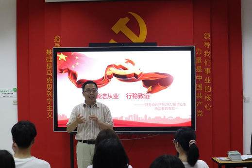 为引导毕业生廉洁从业,帮助学生树立正确的就业观,6月7日,财务会计学院在党员之家召开“廉洁从业,行稳致远”毕业生廉洁教育座谈会,学院副院长冯江涛受邀作为主讲人,2022届毕业生代表参加会议。