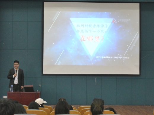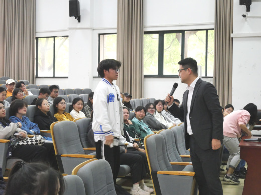 随后,王敏志从宏观层面讲述择业的法律、经济、政治、文化等四大风口要素,引导学生要从趋势和时机两方面作出判断。他指出人工智能、区块链等为现在的行业风口,鼓励学生要在风口处积极择业。针对如何把握风口这一问题,他提出“知识积累、结构重塑”“经验积累、归纳演绎”“应用积累、分析阐释”三大建议。最后,王敏志寄语学生,一是要从趋势中判断潜在方口,二是要以一体两翼三子的方法对潜在风口提前进行布局,三是要满怀信心做好互补,并祝愿大家未来都能找到心仪的工作。