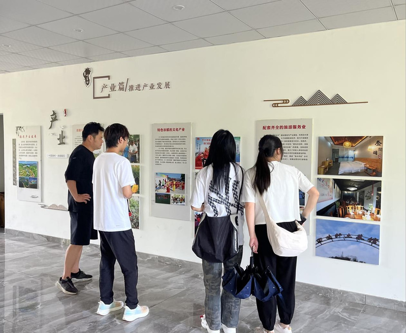 来到党群服务中心,赋石村团支部书记王子建给同学们介绍赋石村的相关产业。在书记的带领下,同学们参观了赋石村文化展馆,看到赋石村在政策扶持下日新月异。将地域文化赋予商业价值,结合实地情况,走适合村庄的文旅路线,帮助村民建立民宿、农家乐等产业的商业模式,让村民也成为商户,实现全民共富。这也无不体现着“两山”政策以人民为中心,不断满足人民对美好生活的需求。同时,王子建书记还给成员们介绍了赋石村独有的传统文化,每年的重阳节村里会举办孝子宴,对附近村庄老人开放,彼时在外的儿女都会回来围坐在一起吃上一顿饭,并且他表示现在有意向扩大孝子宴的规模,让更多的人能够参与到其中,感受孝子宴的文化氛围。在孝子宴上,也能让大家尝到特色的船头鱼、孝子糕等安吉美食,也让大家能充分感受以孝兴家、祥和共融的中华传统美德。