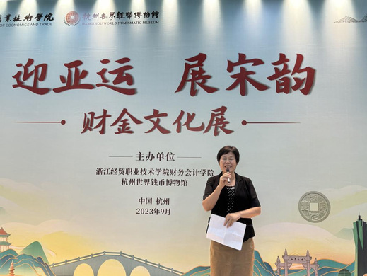 蒋丽君对莅临本次财金文化展的嘉宾表示热烈欢迎。她表示,实施宋韵文化传世工程是浙江省打造重大文化成果、建设文化强省的重要举措。财务会计学院依托“数字财金”专业群与杭州世界钱币博物馆建立了文化实践教育基地,共同开展本次“财金文化展”活动,开创了文化育人新模式,将进一步推进专业建设和人才培养质量提升。