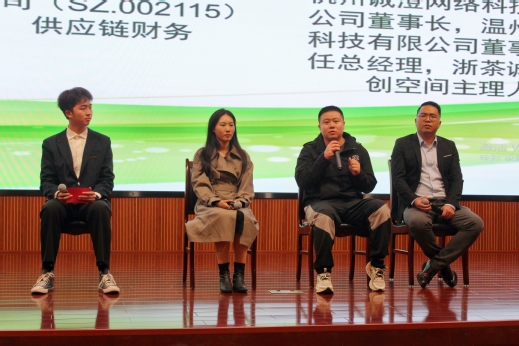 市场营销专业2018届毕业生郑晓娜分享自己一路走来的创业经历,她自言从大一入学就明确了“创业”的目标,之后把握住机会参加实习,再到获取投资人投资,拥有人生第一家公司。在公司收入下滑时,她毅然选择二次创业,转做实业,研制产品,最终取得成功。郑晓娜分享给同学们“人生中的三个点”——“守正用奇”“弱水三千,只取一瓢饮”和“桃李不言,下自成蹊”。她希望同学们能够慎重选择并确立目标,在目标上踏踏实实的下功夫的同时也不要忘了大胆创新,巧用“奇”策。