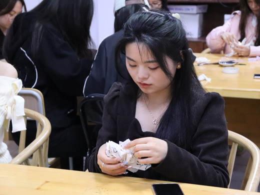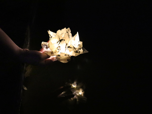 活动中,同学们用毛笔在宣纸写下祝福、诗词或画上可爱的小动物,然后裁剪、折叠出莲花花瓣,翻折出一朵朵墨色莲花。在花芯放入小串灯,一朵发光的墨莲跃然于眼前。莲花灯被放进爱心湖中,微风轻拂水面,灯光下的水面泛出点点微弱的星光,点亮黑暗的湖面。参与同学纷纷表示,活动中体验到了手工折花的乐趣,也在团队合作中“翻折”出“友谊之花”,感受到传统文化的魅力。