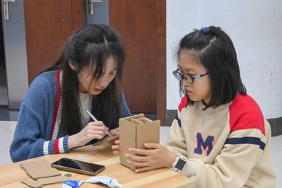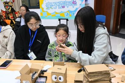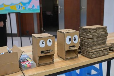 与此同时,在会议中心一楼,工作人员早早准备好了纸板、胶水、剪刀等道具,供孩子们自己动手制作创意小纸盒。校友和孩子们共同体会创作的乐趣,感受作品完成时的喜悦与激动。