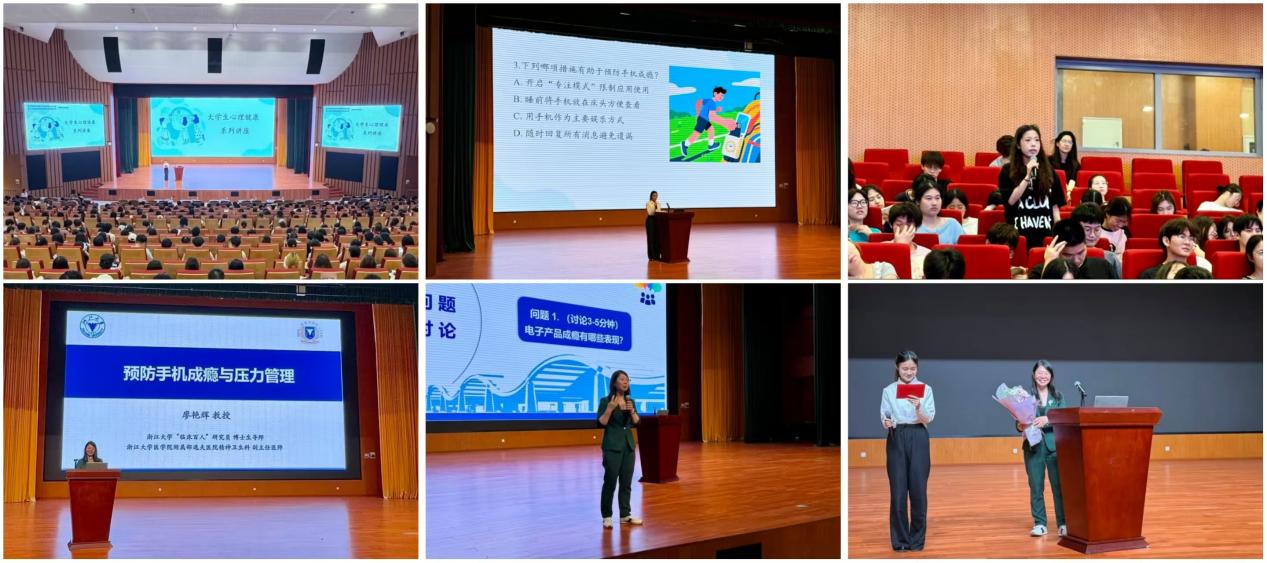 与此同时,在产教融合大楼报告厅,邵逸夫医院精神卫生科副主任医师廖艳辉受邀开展“预防手机成瘾与压力管理”心理健康讲座。讲座前,通过“快问快答”“情绪 ABC 认知重塑”等互动游戏,引导学生思考手机使用与压力管理问题。讲座中,廖主任剖析压力与手机成瘾的内在关联,揭示压力对认知的影响,并提供门诊时间及咨询渠道,鼓励学生借助专业力量提升心理健康水平。学生代表向廖主任献花致谢,表达对讲座内容的收获与感谢。