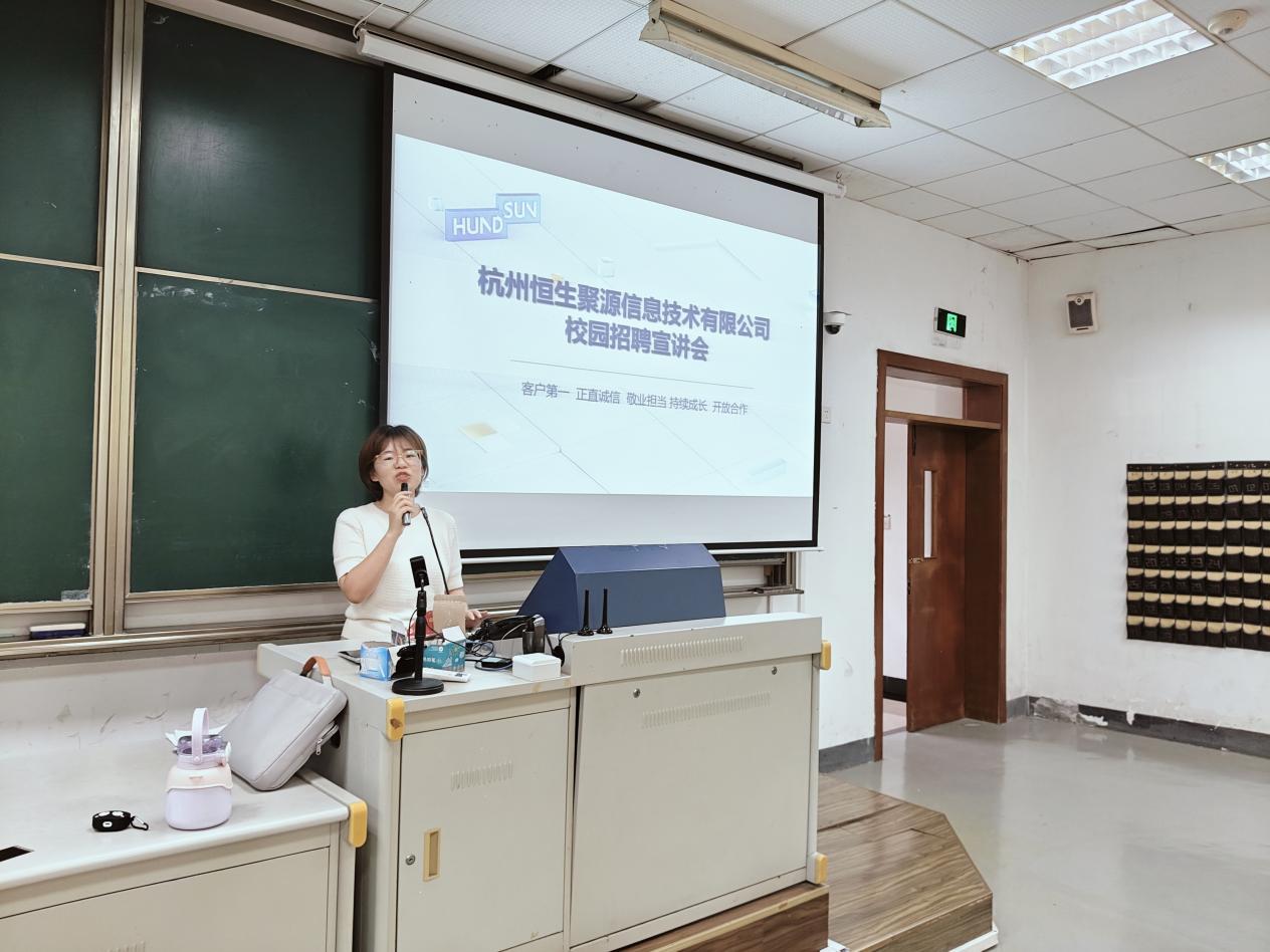 在宣讲会上,恒生聚源人力资源总监胡萍萍首先介绍了公司在金融数据领域25年的发展历程和行业积淀,随后结合行业最新发展趋势,深入分析了金融数据服务行业的人才需求特点和就业前景。在岗位介绍环节,重点解读了数据采编实习生的任职要求、工作内容和"导师制"培养体系,特别强调了完善的职业晋升通道,为同学们提供了清晰的职业发展路径。