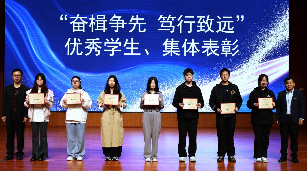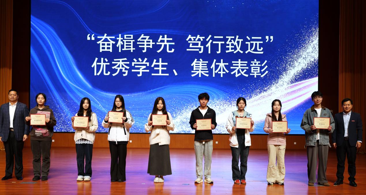 见面会现场举行了“奋楫争先、笃行致远”表彰活动,对39位在德、智、体、美、劳等方面表现优异的学子,以及优秀班级、优秀寝室进行表彰。学生代表为2025级班主任、高中班主任代表献花。活动还特别安排了知识竞答环节,题目不仅覆盖专业核心知识,还融入红色教育、反诈科普、安全知识、《学生手册》要点及廉洁文化等多元内容。学生热情高涨,踊跃参与其中。