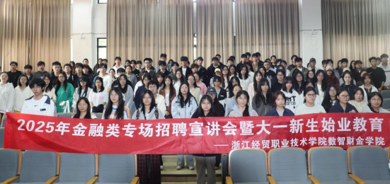 随后,两家金融机构代表依次进行宣讲:浙江农商联合银行代表围绕机构发展历程、业务范围及人才培养体系进行介绍,鼓励同学们勇于实践、脚踏实地,在金融领域开拓事业。新华人寿保险股份有限公司杭州中心支公司代表结合自身从业经历,分享了保险行业的发展趋势和职业晋升路径,帮助学生更好地认识保险职业的多元化与成长空间。