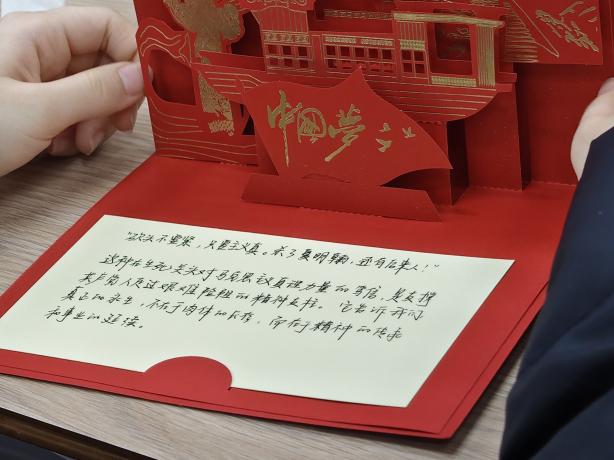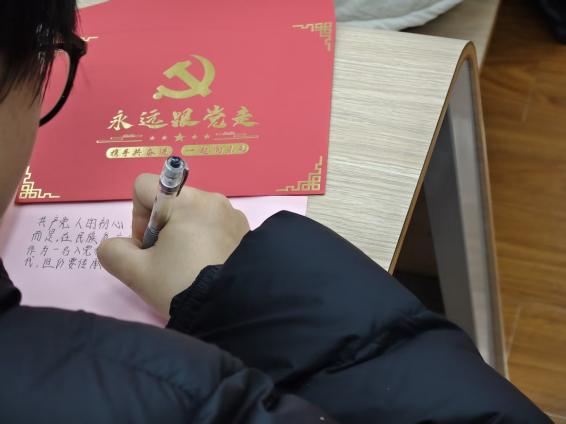 交流分享结束后,活动进入第二环节——初心寄语书写。同学们静心沉思,将品读家书后的触动、对初心使命的理解以及对未来的期许,一笔一画写在寄语卡片上,把理论学习感悟转化为具象化的青春承诺。